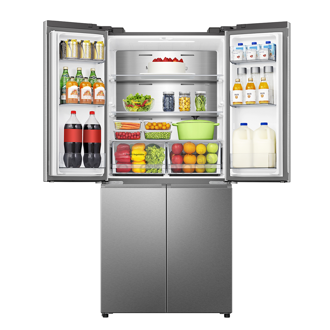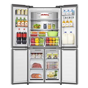 It holds a lot, so there's plenty of space in the fridge and freezer to store all shapes and sizes of food. Plus, it's got four wide-opening doors so you can see everything at a glance.