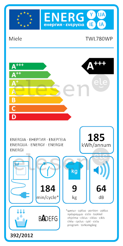 Energy consumption in kW/h per year where as a basis are taken 160 ordinary drying cycles for clothes made of cotton when using an ordinary program under full or partial load and lower energy consumption regime. Actual energy use per cycle depends on the use of the device.